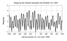 Das nebenstehende Diagramm zeigt die zeitlich veränderliche Neigung der Erdbahn bezüglich der Erdbahn des Jahres 1850. Diese Neigung erreichte ihr letztes Maximum von 4° 00' um das Jahr 38300 v. Chr., und sie wird ihr nächstes Maximum von 2° 23' um das Jahr 34100 n. Chr. erreichen.