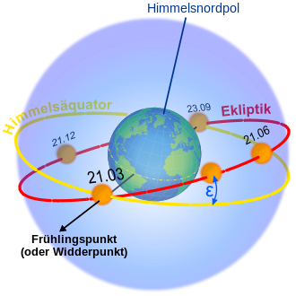 Die Rotationsachse der Erde steht nicht senkrecht auf der Bahnebene, sondern ist leicht geneigt. Entsprechend liegt auch die Äquatorebene der Erde bzw. ihre Projektion auf die scheinbare Himmelskugel, der Himmelsäquator, nicht in der Bahnebene. Der Winkel zwischen Ekliptikebene und Äquatorebene, die so genannte Schiefe der Ekliptik beträgt gegenwärtig etwa ε = 23,44°. Die Schnittlinie zwischen den beiden Ebenen zeichnet sowohl auf der Ekliptik als auch auf dem Äquator eine gemeinsame Referenzlinie aus. In einer der beiden durch die Referenzlinie definierten Richtungen steht die Sonne im Augenblick des Frühlingsbeginns, wenn die (aus Sicht der Erde) auf der Ekliptik wandernde Sonne den Himmelsäquator überschreitet und dabei durch den Schnittpunkt von Ekliptik und Äquator läuft. Die Richtung zu diesem „Frühlingspunkt“ wird als Nullpunkt für astronomische Koordinatensysteme verwendet. Gegenwärtig zeigt diese Richtung auf einen Punkt im Sternbild Fische.
