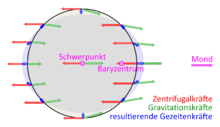 Das Erde-Mond-System besitzt einen gemeinsamen Massenmittelpunkt (Baryzentrum). Dieser liegt auf der Verbindungslinie der Mittelpunkte von Erde und Mond, aufgrund der sehr viel größeren Masse der Erde allerdings im Inneren des Erdkörpers. Auf der dem Mond abgewandten Seite wirken den Erdanziehungskräften höhere Zentrifugalkräfte entgegen. Die flüssigen und gasförmigen Elemente werden deshalb „abgeschleudert“. Aus dem Zusammenspiel der Gravitation des Mondes und des Baryzentrums erklärt sich die 2-Phasigkeit (24h 49min) / 2.