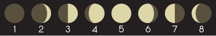 beginnt mit dem Neumond (1). Die Sichelform des Mondes im ersten (2) und letzten Viertel (8) ergibt sich aus dem Umstand, dass der Mond annähernd kugelförmig ist und deshalb