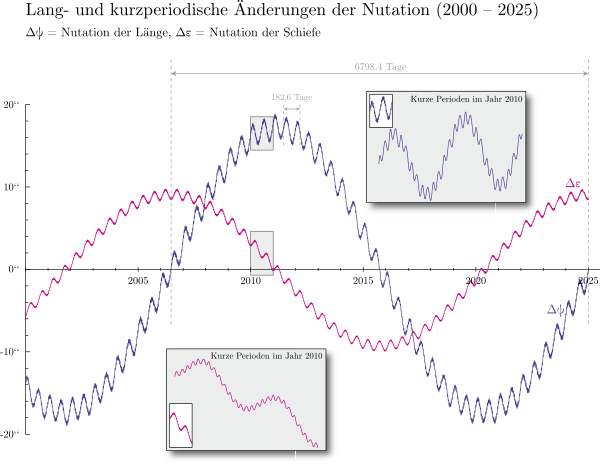 Die Grundlage bilden die periodischen Elemente der Nutation mit ihrer unterschiedlichen Periodendauer (siehe Grafik). Für eine näherungsweise Berechnung kann daher die nachstehende Tabelle insofern abgekürzt werden, dass nur die Elemente mit den höchsten Koeffizienten der Sinus- bzw. Cosinus-Funktion berücksichtigt werden.