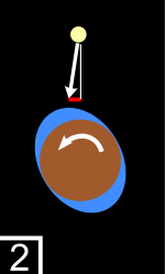 Unter der Gezeitenbeschleunigung des fernen Körpers nimmt der rotierende Körper eine leicht längliche (prolate) Form an. Aufgrund innerer Reibung bei der Verformung ist die Längsachse nicht auf den fernen Körper ausgerichtet, sondern in Rotationsrichtung verdreht. Die Wechselwirkung des fernen Körpers mit dem ihm zugewandten Ende des rotierenden Körpers ist stärker als mit dem abgewandten Ende. Der effektive Angriffspunkt für die Gesamtkraft, das sogenannte Gravizentrum, liegt nicht mehr auf der Verbindungslinie der Baryzentren der beiden Körper, sondern ist etwas in Rotationsrichtung verschoben, was das Drehmoment erklärt.