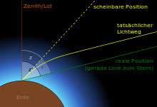 Die astronomische Refraktion biegt jeden Lichtstrahl nach unten – für einen Beobachter auf der Erde erscheinen demnach alle Gestirne höher, als es ohne die irdische Lufthülle der Fall wäre. Ihr Betrag hängt hauptsächlich vom Tangens der Zenitdistanz sowie von Temperatur und Luftdruck am Ort des Beobachters ab. In 5 km Höhe sinkt sie auf etwa 50 % ihres Wertes vom Meeresniveau.