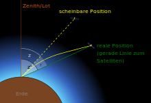 Bei der Messung zu Satelliten wiederum beginnt bzw. endet der Lichtstrahl nicht in völligem Vakuum, und das Ziel ist auch nicht „unendlich“ weit entfernt wie ein Gestirn. Dadurch tritt ein parallaktischer Effekt auf, der einige Prozent der astronomischen Refraktion ausmachen kann (kleiner Winkel s im obigen Bild), bei Satelliten in sehr tiefen Umlaufbahnen (englisch Low Earth Orbit, LEO) jedoch auch mehr.