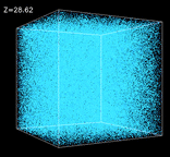 Computersimulation eines Raums von 43×43×43 Megaparsec: Sie zeigt im logarithmischen Zeitraffer, wie sich Regionen größerer Materiedichte durch Gravitation zusammenziehen und dabei kosmische Voids entstehen.