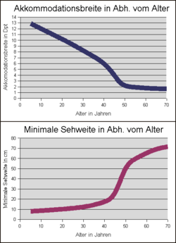 Die Altersabhängigkeit der durchschnittlichen Akkommodationsbreite wird klassisch durch eine Kurve nach Duane beschrieben. Sie ist im oberen Diagramm gezeigt (im Original mit Minimums- und Maximums-Kurve). Die entsprechende altersabhängige minimale Gegenstandsweite („minimale Sehweite“ = Lage des Akkommodationsnahpunktes) für Normalsichtige und Fehlsichtige mit optimaler Fernkorrektur ist in der unteren Grafik dargestellt.