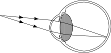 Das Auge hat im entspannten, akkommodationslosen Zustand (Ferneinstellung) eine Brechkraft von etwa 59 Dioptrien (Abkürzung: dpt), was einer Brennweite von 17 mm entspricht.[2] Davon entfallen auf die Hornhaut rund 43 dpt, auf die Linse zwischen 14 und 30 dpt. Die maximal mögliche Brechkraftänderung wird als Akkommodationsbreite bezeichnet. Diese gibt den Bereich zwischen individuellem Nah- und Fernpunkt an, zwischen denen das Auge Objekte scharf sehen kann.[3]