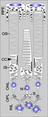 - Die lichtempfindlichen oder fotorezeptiven Zellen, welche das eintreffende Licht in Nervenimpulse umwandeln. Dazu gehören die Stäbchen und Zapfen und eventuell weitere Zelltypen.