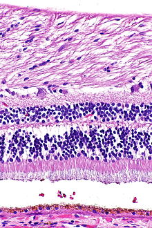 Ein Netzhautquerschnitt zeigt im Lichtmikroskop eine auffällige Schichtung, die durch abwechselnd zellkernreiche und -arme Lagen gebildet wird. Die Schichten besitzen charakteristische Zelltypen und subzelluläre Kompartimente. Die Nervenzellen der Netzhaut lassen sich in drei Gruppen gliedern:
