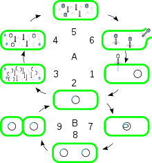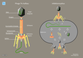 Viren benötigen mangels eines eigenen Stoffwechsels zur Reproduktion einen Wirt, im Falle der Bakteriophagen eine geeignete, lebende Bakterienzelle. Die Reproduktion lässt sich in fünf Phasen gliedern: