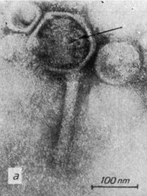 Die Gestalt der Bakterienviren mit Kopf-Schwanz-Struktur (Caudoviren, Klasse Caudoviricetes) wurde vorwiegend an den Bakteriophagen der T-Reihe (T-Serie) von Escherichia coli aufgeklärt. Der Bakteriophage T2 besteht aus einem polyedrischen Kopf von 100 nm Länge, an dem ein etwa gleich langer Schwanz sitzt. Viren werden taxonomisch in erster Linie nach ihrem Genom-Aufbau, und nachrangig nach ihrer Morphologie und ihrem Wirt eingeteilt. So unterscheidet man DNA-Viren mit einzelsträngiger DNA, sogenannte ssDNA-Viren (von engl. single-stranded), und solche mit doppelsträngiger DNA, sogenannte dsDNA-Viren (von engl. double-stranded). Die hier exemplarisch behandelten Escherichia coli-Viren der T-Reihe werden zu letzterer Gruppe gezählt.