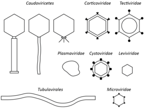 Viren (d.h. die Viruspartikel) besitzen keinen eigenen Stoffwechsel, sondern „leihen“ diesen und Teile des Replikationsmechanimus von ihren Wirten „aus“, um sich genetisch mittels ihrer DNS (oder RNS) zu vermehren („replizieren“). Sie werden daher (von den meisten Autoren) nicht als Lebewesen (im eigentlichen Sinne) angesehen, aber von einigen Wissenschaftlern als „dem Leben nahe“ bezeichnet.[5] Die meisten Bakterienviren (insbesondere die Caudoviren) besitzen, wie zelluläre Organismen, ein dsDNA-Genom (linear oder zirkulär), es gibt aber auch Beispiele für andere Genomorganisationen (ssDNA, und RNA).