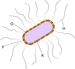 - flagellare H-Antigene für die Flagellen, abgeleitet von „mit Hauch wachsende Bakterien“, da sie durch ihre aktive Fortbewegung auf einer Agarplatte ein mattes Kräuselmuster erzeugen, das wie eine angehauchte Glasplatte aussieht. Es handelt sich um Proteinantigene.