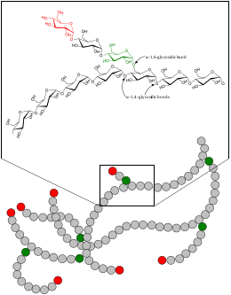 Amylopectin enthält eine Hauptkette aus 1,4-α-glycosidisch gebundenen D- Monosaccharid-Einheiten von Glucose und davon ausgehend an etwa jedem 25. Glucoserest eine α-1,6-glykosidisch verknüpfte Seitenkette.
