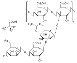 Bei Xanthan besteht das Backbone aus β-(1→4)-verknüpften D-Glucoseeinheiten. An jede zweite Glucoseeinheit ist α-(1→3)-glycosidisch eine β-D-Mannopyranosyl-(1→4)-β-D-glucuronopyranosyl-(1→2)-6-O-acetyl-α-D-mannopyranosyl-Seitenkette geknüpft.