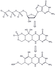 Einige biosynthetische Schritte bei der Bildung von Molydopterin.