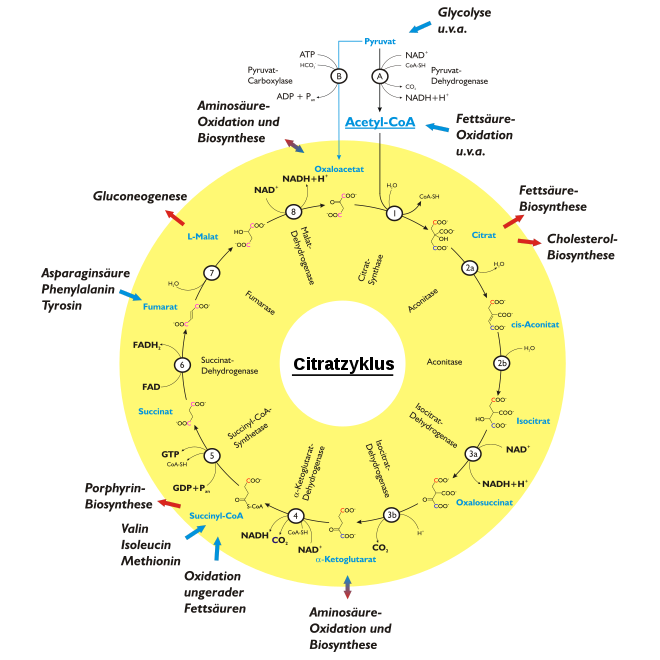 Der Reaktionsablauf des Citratzyklus; blaue Pfeile symbolisieren anaplerotische, rote Pfeile cataplerotische Stoffwechselwege, die eng mit dem Citratzyklus verbunden sind.
