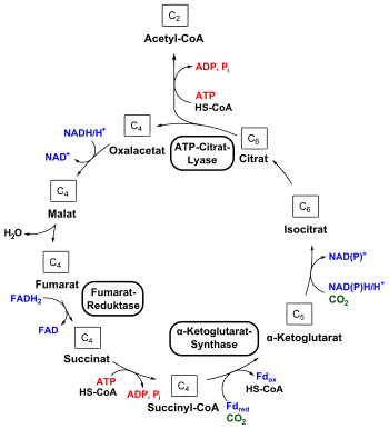 - An Succinyl-CoA kondensiert ein Molekül CO2 unter Verbrauch von reduziertem Ferredoxin. Diese reduktive Carboxylierung wird durch die α-Ketoglutarat-Synthase katalysiert. Dies umgeht die von der α-Ketoglutarat-Dehydrogenase vermittelten Decarboxylierung im ox. Citratzyklus.