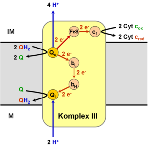 Cytochrom c kann allerdings nur ein Elektron aufnehmen, daher wird zunächst QH2 nur zum freien Radikal Ubisemichinon (QH•) oxidiert. Dieses ist aber instabil und gibt das zweite Elektron sofort über die Proteine Cytochrom bL und Cytochrom bH des Komplexes an ein weiteres Ubichinon ab, das an der matrixseitigen (M) inneren Bindestelle Qi gebunden ist und nun seinerseits zu einem Radikal Ubisemichinon (QH•) reduziert wird. Ein an der Qo-Stelle neu hinzukommendes Ubihydrochinon gibt nun seine Protonen an den Intermembranraum ab und liegt wieder in seiner oxidierten Form vor. Es diffundiert von der Qo-Stelle ab und geht in den Ubichinonpool ein.