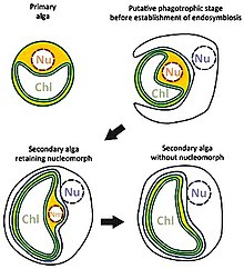 - Die besten Belege für sekundäre Endosymbiosen finden sich bei den Chlorarachniophyceen, zu den Cercozoa gehörende Amöben, und den Cryptophyceen, einer eigenständigen Algenklasse. Beide Algengruppen enthalten komplexe Plastiden mit vier Hüllmembranen. Zwischen den beiden äußeren und den beiden inneren Hüllmembranen befindet sich der periplastidäre Raum mit einem Nucleomorph, einem stark reduzierten eukaryotischen Zellkern mit je drei linearen kleinen Chromosomen und eukaryotischen 80-S-Ribosomen. Genomsequenzierungen und phylogenetische Analysen zeigten, dass Nucleomorph und Plastid der Chlorarachniophyceen auf eine sekundäre Endosymbiose mit einer Grünalge, der komplexe Plastid der Cryptophyceen jedoch auf eine sekundäre Endosymbiose mit einer Rotalge zurückzuführen sind. Von der Chlorarachniophycee Bigelowiella natans und von der Cryptophycee Guillardia theta wird/wurde das Nucleomorph-Genom vollständig durchsequenziert. Da bei Rotalgen die Stärkesynthese im Cytoplasma stattfindet und nicht wie bei den Grünalgen und Landpflanzen im Plastiden, spricht das Vorkommen von Stärke im periplastidären Raum der Cryptophyceen ebenfalls für eine sekundäre Endosymbiose.
