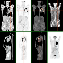 Bei der Tuberkulose tritt durch die Besonderheiten der auslösenden Bakterien eine käsige Nekrose (auch Verkäsung genannt) auf. Gangrän kennzeichnet eine besondere Nekroseform, die schwarz ist und wie verbrannt aussehen kann. Die Gangrän ist trocken (trockene Gangrän), außer sie wird von Fäulnisbakterien befallen und entzündet sich (feuchte Gangrän). Bei der bereits im 19. Jahrhundert bekannten Fettnekrose oder Fettgewebsnekrose handelt es sich um den Tod von Fettzellen, zum Beispiel eine verkalkte Nekrose im Fettgewebe um die Bauchspeicheldrüse herum.[8][9] Sie entsteht traumatisch oder enzymatisch durch freigesetzte Lipasen aus der Bauchspeicheldrüse im Rahmen einer Bauchspeicheldrüsenentzündung. Weitere Sonderformen sind die gummatöse Nekrose, die bei Syphilis auftritt, und die fibrinoide Nekrose, die für rheumatische Polyarthritis, Polyarteriitis nodosa oder für peptische Magenulcera typisch ist.[3]