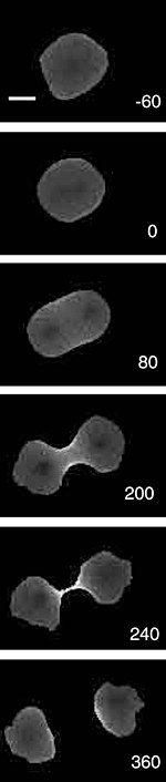 (Zeitangabe in Sekunden relativ zum Beginn der Anaphase; Maßstab oben: 5 µm)