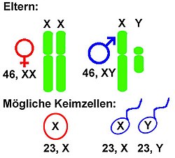 Wenn das Geschlecht chromosomal bestimmt wird, wird es entsprechend den Mendelschen Regeln vererbt. Diese Form der Geschlechtsbestimmung ist im Lauf der Evolution bei verschiedenen Artengruppen unabhängig voneinander entstanden[1] und kommt beispielsweise bei Säugetieren, Vögeln und einigen Insekten[2], aber auch in Gefäßpflanzen vor. Bei anderen Arten wird das Geschlecht dagegen durch Umweltbedingungen festgelegt, z. B. durch die Temperatur bei der Embryonalentwicklung (siehe Geschlechtsdetermination).
