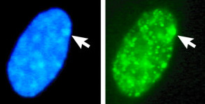 Beim Menschen, der Maus, der Katze[19][20] und möglicherweise den Säugetieren generell wird eines der beiden weiblichen X-Chromosomen inaktiviert. Das inaktive X-Chromosom erfährt dabei eine Reihe von Veränderungen, die es zum lichtmikroskopisch nachweisbaren Barr-Körperchen machen (siehe Abbildung).