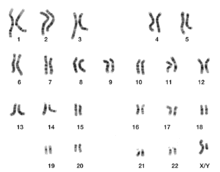 Zur Beschreibung des menschlichen Karyotyps hat sich eine Kurzschreibweise durchgesetzt, die die Gesamtchromosomenzahl, die Art der Geschlechtschromosomen und im klinischen Gebrauch bei Bedarf auch Chromosomenanomalien wiedergibt. Bei Menschen ergibt sich in dieser Schreibweise normalerweise 2n = 46,XX für Frauen und 46,XY für Männer. X und Y geben dabei jeweils ein X-Chromosom bzw. ein Y-Chromosom an. Besonderheiten unter den Autosomen können in Form einer zusätzlichen Zahl angegeben werden; einige bekannte Chromosomenveränderungen werden entsprechend benannt: