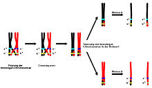 Ein Crossing-over findet bei Teilungen des Zellkerns während der Prophase der Meiose I statt. Dabei handelt es sich nicht etwa um Fälle fehlerhafter DNA-Reparatur, sondern um einen Vorgang, dessen Ablauf im Zellkern durch hierfür gebildete Strukturen – den synaptonemalen Komplex – wohlorganisiert erleichtert wird. So kommt es während der 1. meiotischen Teilung im Zygotän der Prophase zur parallelen Aneinanderlagerung der Chromatiden eines homologen Chromosomenpaars, womit im anschließenden Stadium, dem Pachytän, ein Crossing-over zwischen einander nach Genloci entsprechenden Abschnitten von Nichtschwesterchromatiden möglich wird. Hierdurch können Anteile zwischen maternalen und paternalen Chromosomen getauscht werden, was neue Kombinationen entstehen lässt (intrachromosomale Rekombination). Im folgenden Stadium lösen sich die Chromosomen wieder voneinander, und zuvor ereignete Crossover werden nun im Diplotän auch lichtmikroskopisch als Chiasmata sichtbar.[1]