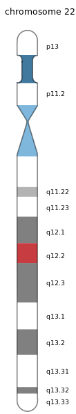 Bei der konventionellen Benennung eines Genortes wird zunächst die Nummer des Chromosoms angeführt, dann der Chromosomenarm bezüglich des Centromers gekennzeichnet – entweder mit dem Buchstaben p für den kürzeren Arm (französisch bras petit ‚kleiner Arm‘) oder mit q für den längeren – und schließlich die chromosomale Region auf diesem Arm genauer angegeben durch Ziffern für die Bande und die Unterbande, getrennt durch einen Punkt. Im abgebildeten Idiogramm ist zum Beispiel der Genlocus 22q12.2 (gelesen „zweiundzwanzig-q-eins-zwei-punkt-zwei“) rot markiert.