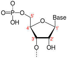 Die Grundbausteine einer Nukleinsäure sind die Nukleotide. Deren zentrales Element ist die Ribose. Die Kohlenstoff-Atome dieses Moleküls werden im Uhrzeigersinn durchnummeriert; dabei wird jede Nummer mit der Prime ′ (sprich Strich, englisch prime) versehen. Zum Beispiel unterscheidet die Hydroxygruppe an der 2′-Position der Ribose die RNA von der DNA. Die Desoxyribose trägt nämlich an 2′ keine OH-Gruppe.