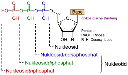 - Nukleobase + Pentose + 2 Phosphatreste = Nukleotid (Nukleosiddiphosphat)