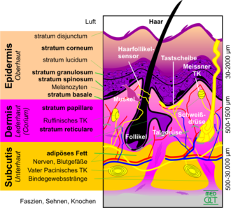 Von innen nach außen unterscheidet man fünf Epidermis-Schichten: Basalschicht (Stratum basale), Stachelzellschicht (Stratum spinosum), Körnerschicht (Stratum granulosum), Glanzschicht (Stratum lucidum) und Hornschicht (Stratum corneum). Die Epidermis besteht zu 90 Prozent aus Keratinozyten, die von Desmosomen zusammengehalten werden[1]. In den äußeren Schichten besteht sie aus verhornten Plattenepithelzellen.