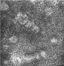 Konfokales Bild der Stachelzellschicht mit einigen durchscheinenden Basalzellhaufen im horizontalen Schnitt