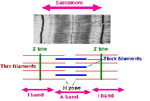 Der Bereich um die M-Scheiben wird als H-Zone bezeichnet (Hensen-Zone benannt nach Victor Hensen), dort befinden sich nur Myosinfilamente. Der Bereich um die Z-Scheiben wird als I-Band bezeichnet (I=isotrop, einfach lichtbrechend), dort befinden sich nur Aktinfilamente. Der Bereich zwischen zwei I-Bändern wird als A-Band bezeichnet (A=anisotrop, doppelt lichtbrechend).