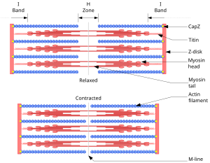 Das Myosinfilament ist an M- und Z-Scheibe über das elastische Titinfilament verknüpft, welches am Myosinfilament gebunden zur M-Scheibe verläuft. Aktuellen Erkenntnissen zufolge soll das Titinfilament das Myosinfilament während der Kontraktion zwischen den Z-Scheiben zentrieren und eine Federfunktion übernehmen, daher ist es zu den Z-Scheiben hin federartig gewunden. Die Enden der Aktin- und Myosin-/Titinfilamente überlappen sich. Zusammenfassend sieht die Sequenz der Sarkomerabschnitte folgendermaßen aus: Z – I – A – H – M – H – A – I – Z. Ein Sarkomer besteht also insgesamt aus einem A-Band und zwei halben I-Bändern.