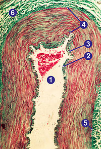 - Die Tunica media (oder kurz Media) ist bei den peripheren Arterien aus mehreren, dicht anliegenden, ringförmigen und schräg gewundenen Muskelschichten aufgebaut, die auch elastische Fasern und solche aus Kollagen enthalten, bei den elastischen Arterien ähnlich aufgebaut, allerdings mit mehr Kollagen und vielen schwingungsfähigen und gefensterten Membranen. Teilweise befindet sich zwischen der Media und der Adventitia noch zusätzlich eine elastische Schicht (Membrana elastica externa, Elastika), die mittels Elastika-Färbung darstellbar ist.