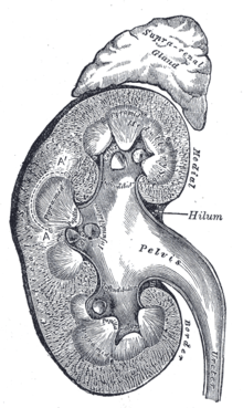 Das Nierenparenchym, die eigentliche Organmasse der Niere, wird in die außen liegende Nierenrinde (Cortex renalis) und das nach innen zum Hilum gerichtete Nierenmark (Medulla renalis) unterteilt. Das Mark besitzt dabei die Form von Pyramiden (10 bis 12 Markpyramiden oder Nierenpyramiden), die mit ihrer Basis nach außen und mit ihrer Spitze nach innen zum Hilum zeigen. Diese Spitzen, die Papillen, reichen frei in den Hohlraum der Nierenkelche (Calix renalis), die sich in variabler Form zum Nierenbecken (Pelvis renalis) zusammenschließen, aus dem der Ureter hervorgeht. In dieser Anordnung fließt der Urin aus den Papillen in Richtung Ureter.