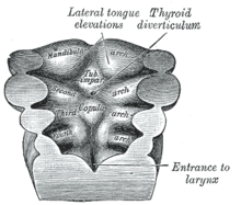 Öffnung des Ductus thyreoglossus (thyroid diverticulum) in Höhe des zweiten Kiemenbogens