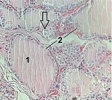 Follikel mit Kolloid (1), Follikelepithelzellen (2), C-Zelle (Pfeil)