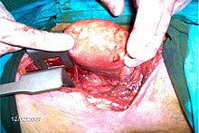 Der Situs im weiteren Verlauf; der vergrößerte Schilddrüsenlappen wird herauspräpariert, sichtbar die Ligaturen zur Blutstillung.