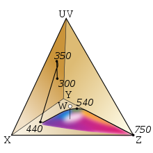 Dabei können unterschiedliche spektrale Zusammensetzungen des Farbreizes zur gleichen Farbwahrnehmung führen. Allein aus der wahrgenommenen Farbe kann daher nicht auf die Zusammensetzung des Farbreizes geschlossen werden. Ausschließlich Reize durch monochromatisches Licht einer bestimmten Wellenlänge sind auch charakterisierbar durch die wahrgenommene Farbe, als dessen Spektralfarbe.