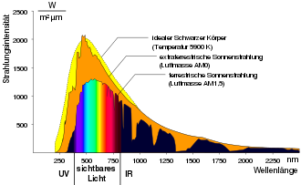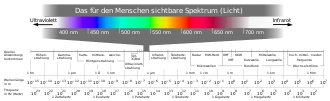 Menschen können elektromagnetische Strahlung nur in dem Bereich visuell wahrnehmen, in dem das Sonnenspektrum den überwiegenden Anteil seiner Energie enthält. Der wahrnehmbare Bereich beginnt bei ca. 380 nm und endet bei etwa 780 nm. Da die Bezeichnung „Licht“ in der Physik gelegentlich auch für andere Abschnitte des elektromagnetischen Spektrums verwendet wird, hat sich für den sichtbaren Spektralbereich der Ausdruck „sichtbares Licht“ eingebürgert. Er umfasst die Farben von Blau-Violett über Grün und Gelb bis Dunkelrot. Sie können z. B. durch ein Prisma sichtbar gemacht werden. Einige Tiere können über den für Menschen sichtbaren Bereich hinaus sehen, beispielsweise Bienen, die auch das angrenzende nahe UV-Licht sehen. Unter optimalen Bedingungen und sehr hoher Lichtstärke können die Grenzen der menschlichen Wahrnehmung 310 nm (UV) bis 1100 nm (NIR) betragen.