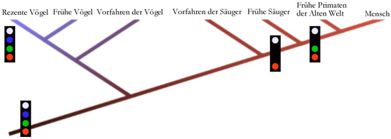 Vögel besitzen vier Zapfentypen, deren Absorptionsmaxima bei 370 nm (UV-Typ), 445 nm (S-Typ), 508 nm (M-Typ) und 565 nm (L-Typ) liegen. Auf Grund von Vergleichen der DNA-Sequenzen verschiedener Opsin-Typen bei verschiedenen rezenten Tieren nimmt man an, dass auch die gemeinsamen Vorfahren der Vögel und Säuger vier Zapfentypen besaßen. In einer frühen Phase der Säugerevolution gingen die mittleren S- und M-Typen verloren. Es wird angenommen, dass diese Tiere nachtaktiv waren und deswegen diese Veränderung im Sehsystem tolerieren konnten. Wie eine Abschätzung der Evolutionsdauer mit Hilfe der molekularen Uhr ergab, entstand mit dem Übergang zur Tagaktivität vor 30 bis 40 Mio. Jahren bei den Vorfahren der Primaten der Alten Welt durch Genduplikation ein dritter Zapfentyp, so dass wieder ein M-Typ (530 nm) zur Verfügung stand, dessen Absorptionsmaximum sich aber nur wenig vom L-Typ (560 nm) unterscheidet. Ein selektiver Vorteil bestand möglicherweise darin, dass sich mit drei Zapfentypen Früchte als Nahrungsquelle besser unterscheiden lassen als mit zwei.
