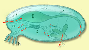 C Blutkreislauf (oder Lymphe), D Verdauungstrakt, E Exkretionsöffnung, N Nervensystem, R Atmung[1]