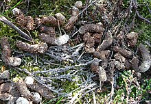 Unverdaute und unverdauliche Bestandteile der Nahrung passieren meist den Darm zur Defäkation. Dazu gehören auch die hellen kalkreichen festen Ausscheidungen von Hyänen oder anderen Raubtieren, welche aus Resten der aufgenommenen Knochen bestehen.[22] Manche Feststoffe werden regelmäßig über den Aufnahmeweg wieder abgegeben oder ausgewürgt, so generell bei Nesseltieren (Cnidaria) oder vielen Vögeln (Nashornvogel), aber (zumindest gelegentlich) bei allen Tieren mit Mund (Erbrechen[23][24], Gewölle). Dieser Vorgang wird jedoch nur selten der Exkretion zugerechnet.[25]
