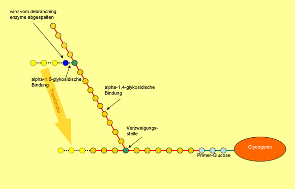 Die Glykogenphosphorylase kann das Glykogen allerdings nur bis zum vierten Glucose-Molekül vor der nächsten Verzweigungsstelle abbauen. Um den weiteren Abbau zu ermöglichen, entfernt die Transferasedomäne des Glykogen-Debranching-Enzym drei der vier Glukose-Moleküle vor der Verzweigungsstelle (hell-gelbe Kreise in der Abbildung) und fügt sie an einer anderen Seitenkette linear (also alpha-1,4-glykosydisch gebunden) an. Die Glucose-Moleküle dieser Seitenkette können nun wieder einzeln durch die Glykogenphosphorylase abgespalten werden.