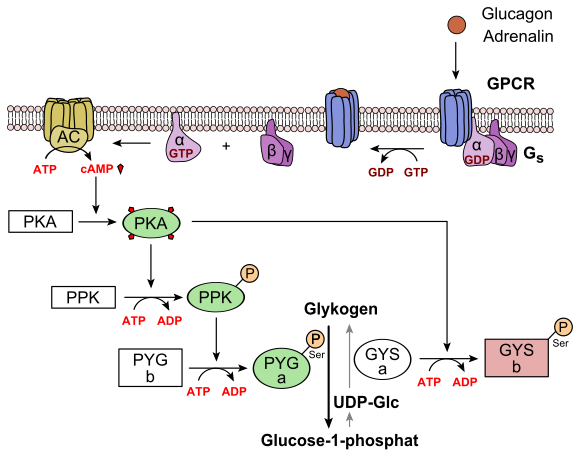 Adrenalin (Muskel) oder Glucagon (Leber) aktivieren einen G-Protein gekoppelten Rezeptor (GPCR), an der ein Gs-Protein angedockt ist. Dessen α-Untereinheit hat GDP gebunden, welches nach Aktivierung des GPCR mit GTP ausgetauscht wird. Dadurch wird die α-Untereinheit vom Rezeptor freigesetzt und aktiviert eine Adenylylcyclase (AC). Das dabei gebildete cAMP aktiviert eine Proteinkinase A (PKA), die wiederum die Phosphorylierung einer Phosphorylase-Kinase (PPK) katalysiert. Die dadurch stimulierte Kinase aktiviert katalytisch eine Glycogenphosphorylase (PYG), welche den Abbau von Glykogen zu Glucose-1-phosphat katalysiert. Proteinkinase A phosphoryliert gleichzeitig eine UDP-Glykogensynthase (GYS), welche dadurch inaktiviert wird und die Umkehrreaktion nicht mehr katalysieren kann.