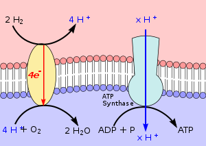 Lithotrophe Organismen erhalten durch Redoxreaktionen ihr Membranpotenzial aufrecht. Dabei sind H+-produzierende Reaktionen meist auf der Außenseite der Zellmembran lokalisiert, während auf der Innenseite eher Reaktionen lokalisiert sind, die H+ verbrauchen. Links oben im Bild entsteht H+ aus der Oxidation von Wasserstoff. Links unten im Bild wird H+ verbraucht. Zusammen mit den vier Elektronen, die durch ein Transmembran-Komplex die Membran durchqueren, entsteht nach